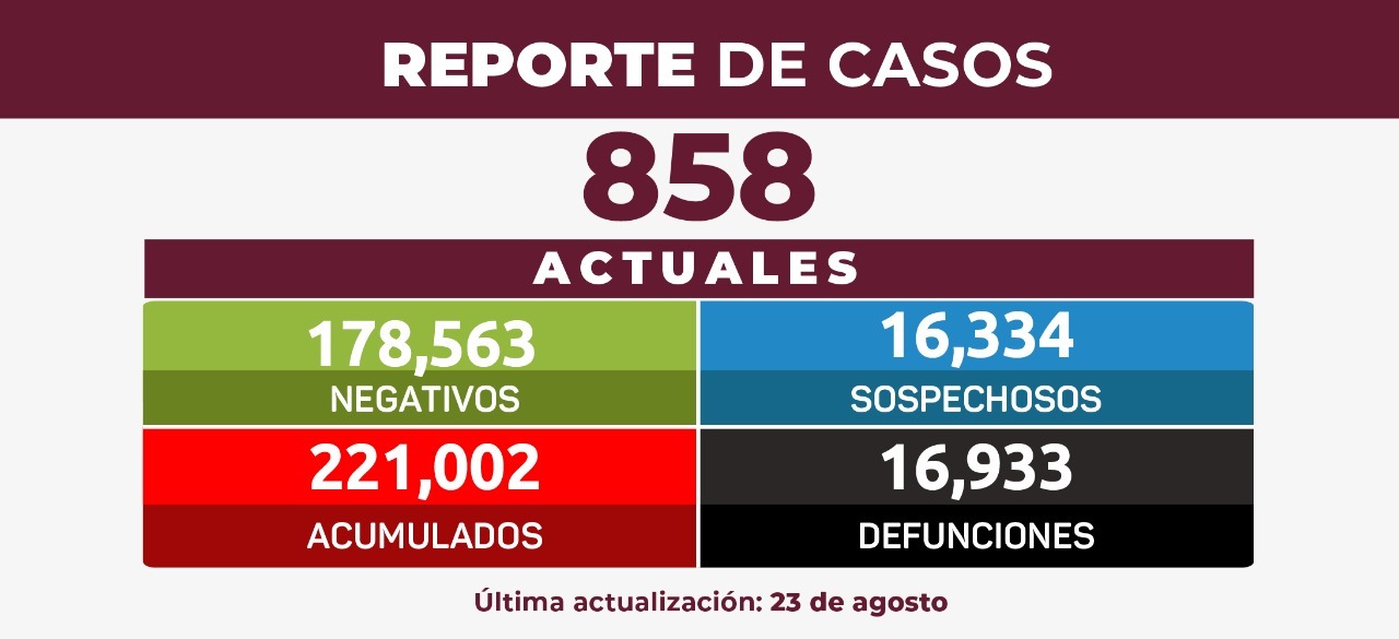 Al corte de agosto, Veracruz suma 221 mil 002 casos confirmados de COVID-19, luego de 415 mil 899 estudios practicados; confirmando 858 positivos y 121 sospechosos activos.