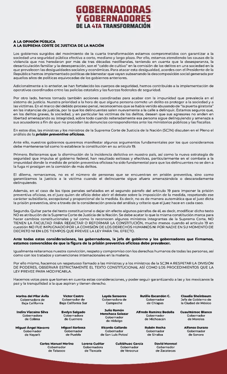 "Estamos convencidos de que la figura de la presión preventiva oficiosa debe prevalecer (...) Hacemos un respuesto llamado para que las ministra y los ministros de la SCJN a respetar la división de poderes, observar estrictamente el texto Constitucional así como los procedimientos que la ley provee para modificarla".
