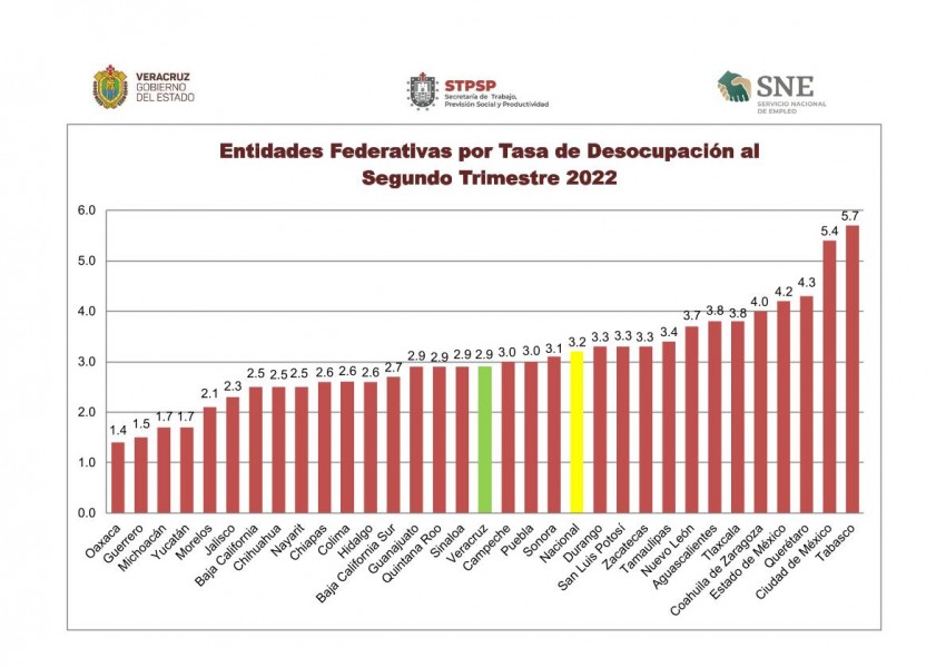 Además, Veracruz presentó una tasa de desempleo del 2.9%, en el segundo trimestre de 2022, ubicándolo por debajo del 3.2% de la media nacional, según la Encuesta Nacional de Ocupación y Empleo Nueva Edición del Instituto Nacional de Estadística y Geografía.