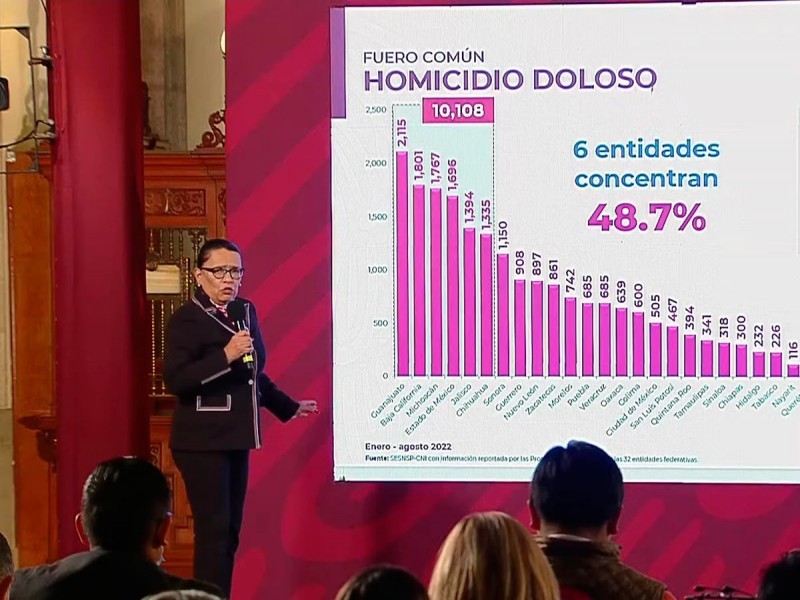 Resaltó que en el periodo de enero a agosto del presente año se registraron 20 mil 722 víctimas de homicidio; no obstante, ello representa una baja de 8.4 por ciento respecto al mismo periodo, pero de 2021; de 12 por ciento respecto a 2020; y de 10.6 por ciento, en compasión con 2019.