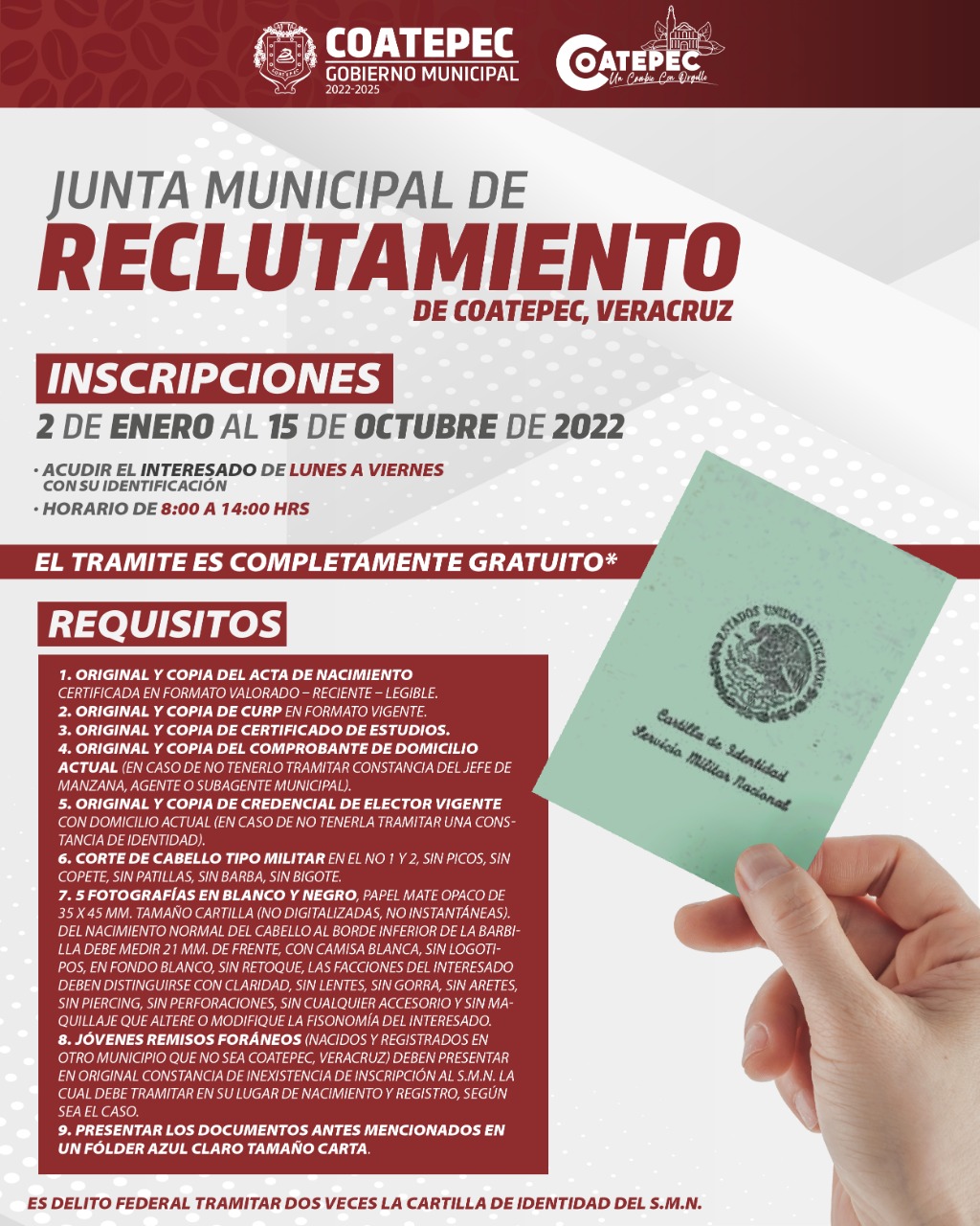 El H. Ayuntamiento de Coatepec invita a jóvenes de clase 2004 y remisos a tramitar su Cartilla de Identidad Militar, la recepción de documentos es de lunes a viernes en horario de 8:00 a 14:00 hrs.