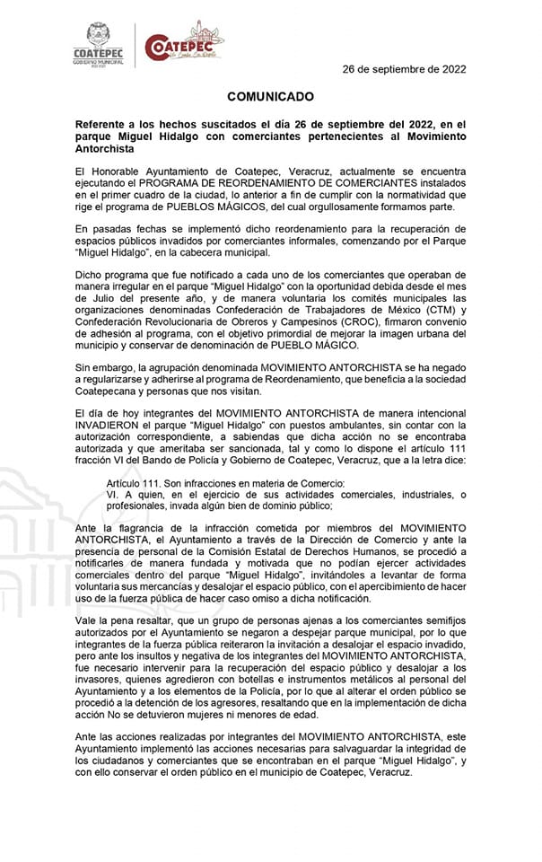El día de hoy integrantes del MOVIMIENTO ANTORCHISTA de manera intencional INVADIERON el parque “Miguel Hidalgo” con puestos ambulantes, sin contar con la autorización correspondiente, a sabiendas que dicha acción no se encontraba autorizada y que ameritaba ser sancionada, tal y como lo dispone el artículo 111 fracción VI del Bando de Policía y Gobierno de Coatepec, Veracruz, que a la letra dice: