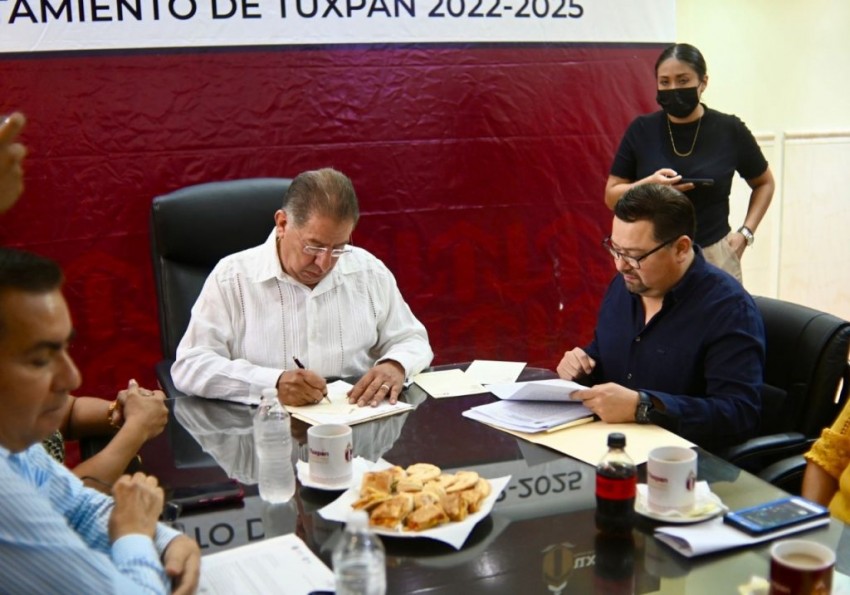 El Lic. Daniel Cortina Martínez, secretario Técnico del Ayuntamiento; el Lic. José Armando Huesca Ovando, Secretario del Ayuntamiento; y el delegado regional de la SEV en Tuxpan, Prof. Onésimo Pérez Ramos.