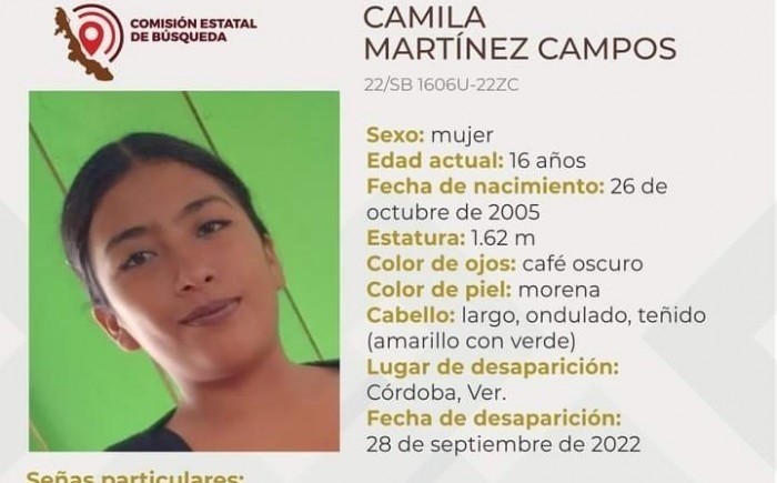Por su parte, Camila Martínez Campos de 16 años de edad y con domicilio también en el municipio de Córdoba, desapareció éste miércoles 28 de septiembre, la jovencita mide un metro con 62 centímetros de estatura, ojos cafés oscuros, tiene la tez morena clara, con cabello largo, ondulado y teñido de amarillo con verde, además de que tiene un tatuaje en la espalda, un lunar en la mejilla derecha y usa brackets.