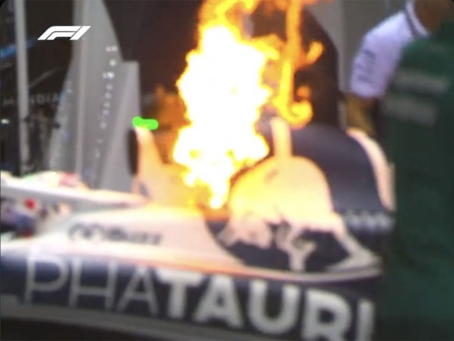 En el momento en que sus mecánicos conectaron el respiradero del combustible, aparecieron las llamas. Uno de ellos agarró un extinguidor para rosear sobre la superficie, momento en que el piloto salía del monoplaza.