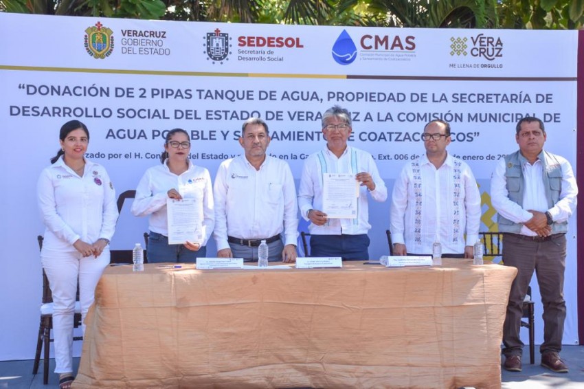 El Secretario de Desarrollo Social de Veracruz, Guillermo Fernández Sánchez y la Directora de la Comisión Municipal de Agua Potable y Saneamiento de Coatzacoalcos, Hildeliza Abigail Díaz Calafell, formalizaron la donación de dos pipas propiedad de la Sedesol a esta dependencia municipal.