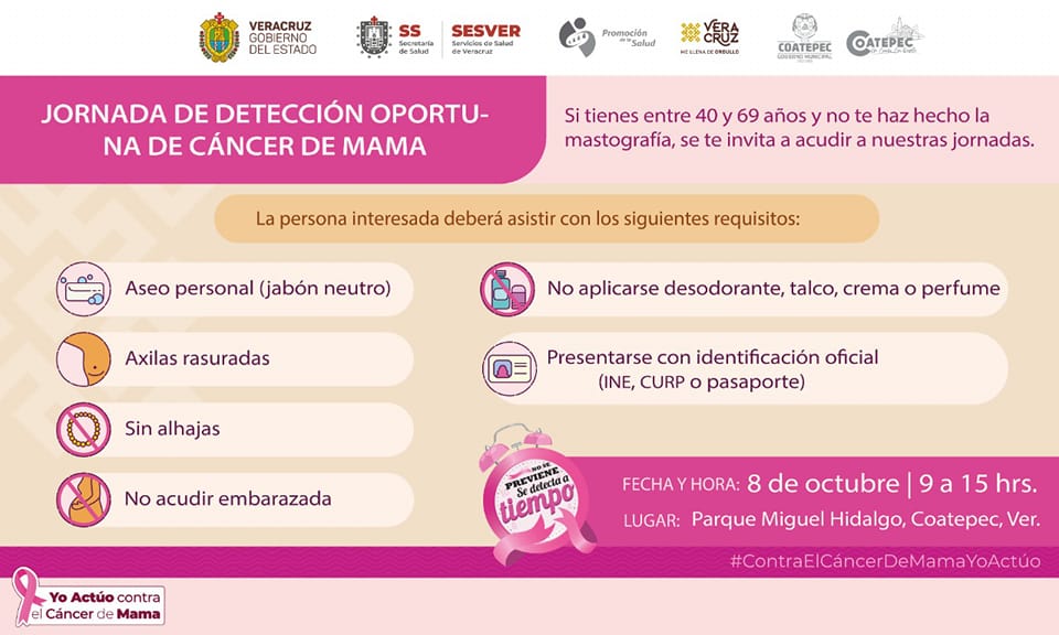 El H. Ayuntamiento de Coatepec, a través del Instituto Municipal de la Mujer, en coordinación con la Secretaría de Salud de Veracruz y el Instituto Veracruzano de la Mujer, llevarán a cabo la Jornada de Detección Oportuna de Cáncer de Mama, el día sábado 8 de octubre en el Parque Miguel Hidalgo en horarios de 9 a 15 hrs.