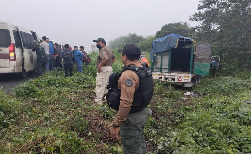 Un camión con al menos 100 migrantes sufrió un accidente en el sur del estado de Veracruz, luego de que el conductor intentó evadir a la Guardia Nacional.