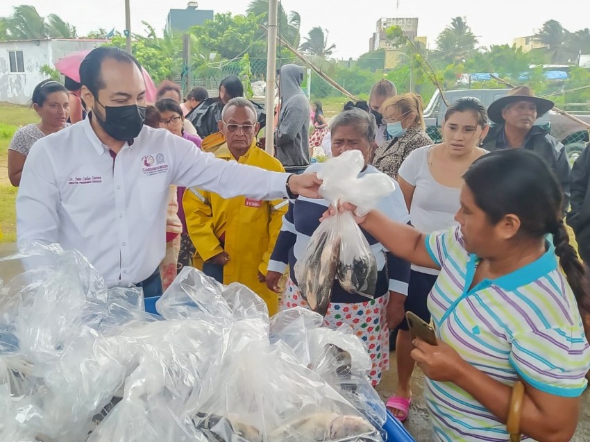 Como apoyo a la economía de los habitantes de sectores populares de Coatzacoalcos, la regidora Segunda, María Sandra Collins Coronel y el director de Programas Sociales, Juan Carlos Carrera Castellanos, acudieron a la colonia Ampliación Almendros, donde ofrecieron mojarras a bajo costo, beneficiando a 60 familias de este lugar.
