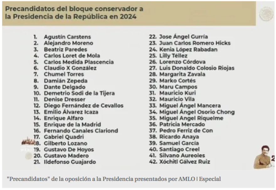 AMLO presenta lista con 42 “precandidatos” de la oposición a la Presidencia Con nombres como Agustín Carstens, Chumel Torres y Lilly Téllez, el mandatario presentó una lista de los posibles 42 precandidatos o aspirantes a la Presidencia de la República en 2024 del bloque conservador.
