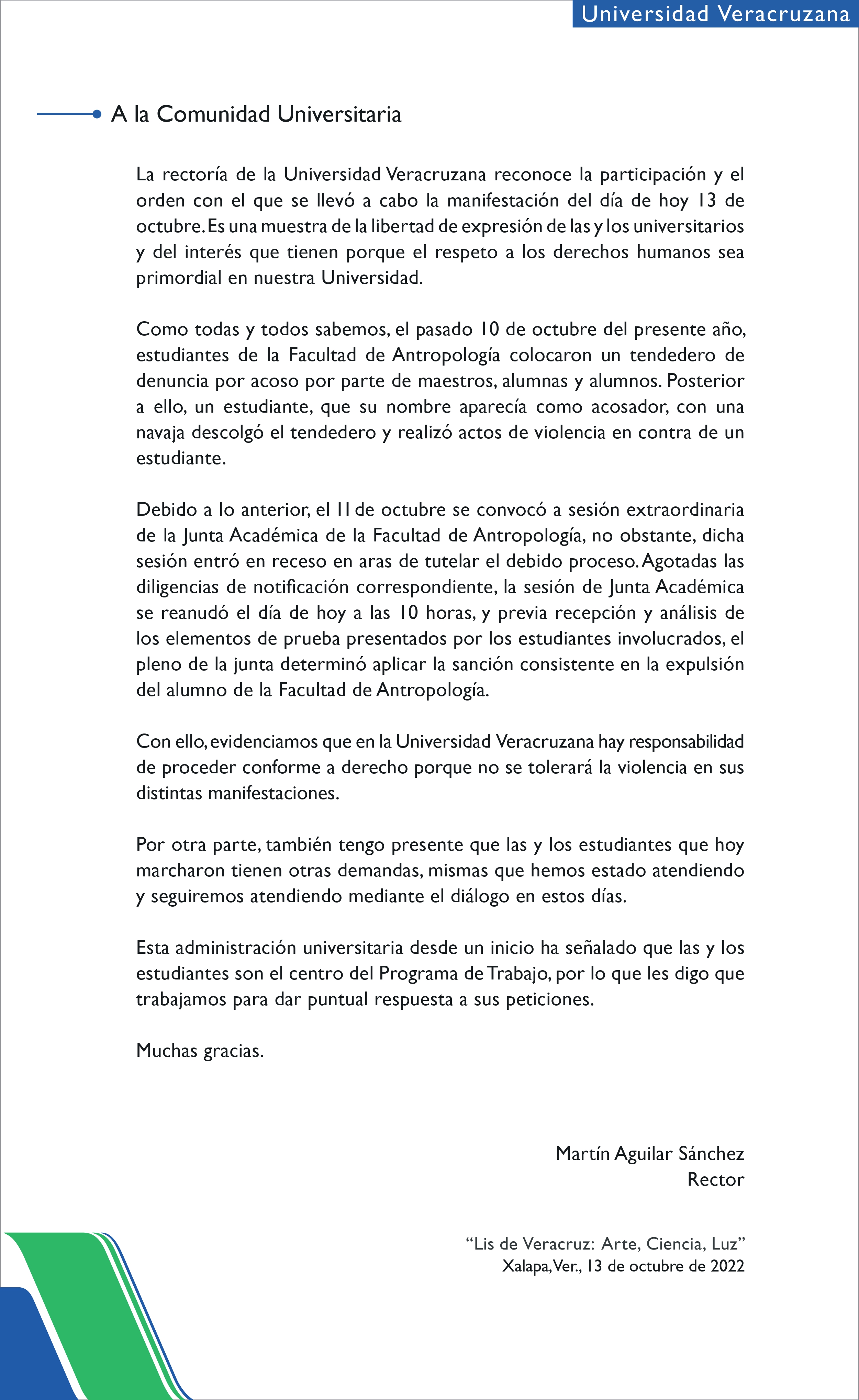 El Rector menciona que "no se tolerara? la violencia" y atenderán las otras demandas