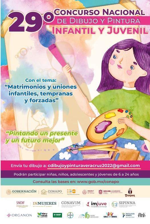 El Consejo Nacional de Población (CONAPO), en coordinación con el Fondo de Población de las Naciones Unidas (UNFPA), convocan a niñas, niños, adolescentes y jóvenes de 6 a 24 años de edad, a participar en el 29° Concurso Nacional de Dibujo y Pintura Infantil y Juvenil 2022, con el tema: “Matrimonios y uniones infantiles, tempranas y forzadas. Pintando un presente y un futuro mejor”.