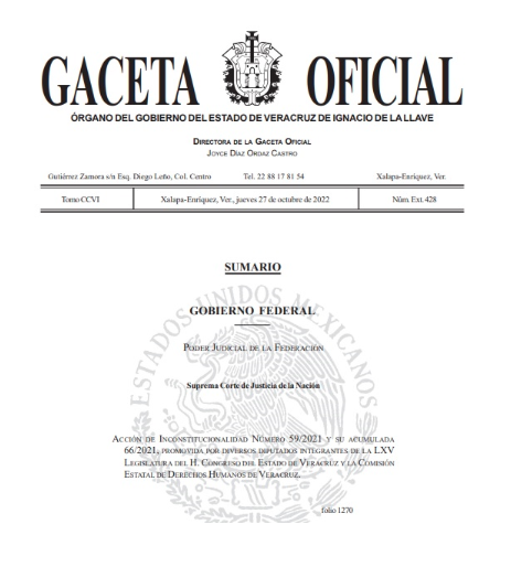 Se trata del documento con folio 1270, en el que señala: “ACCIÓN DE INCONSTITUCIONALIDAD NÚMERO 59/2021 Y SU ACUMULADA 66/2021, PROMOVIDA POR DIVERSOS DIPUTADOS INTEGRANTES DE LA LXV LEGISLATURA DEL H. CONGRESO DEL ESTADO DE VERACRUZ Y LA COMISIÓN ESTATAL DE DERECHOS HUMANOS DE VERACRUZ.”