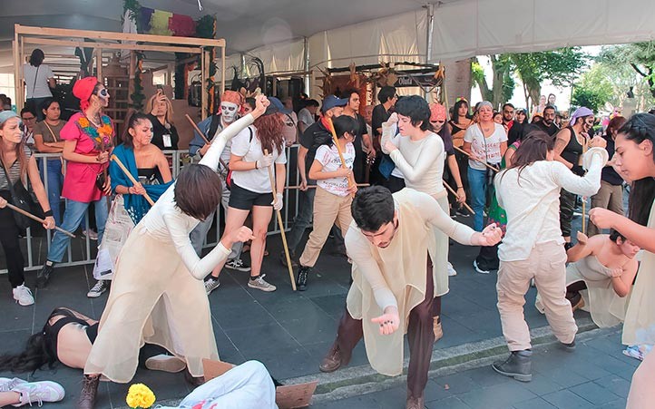 “¡No fue suicidio ni andaba en malos pasos, era una persona trabajadora!”, gritaban los jóvenes antes de danzar y actuar frente a espectadores improvisados que se aglutinaban alrededor.