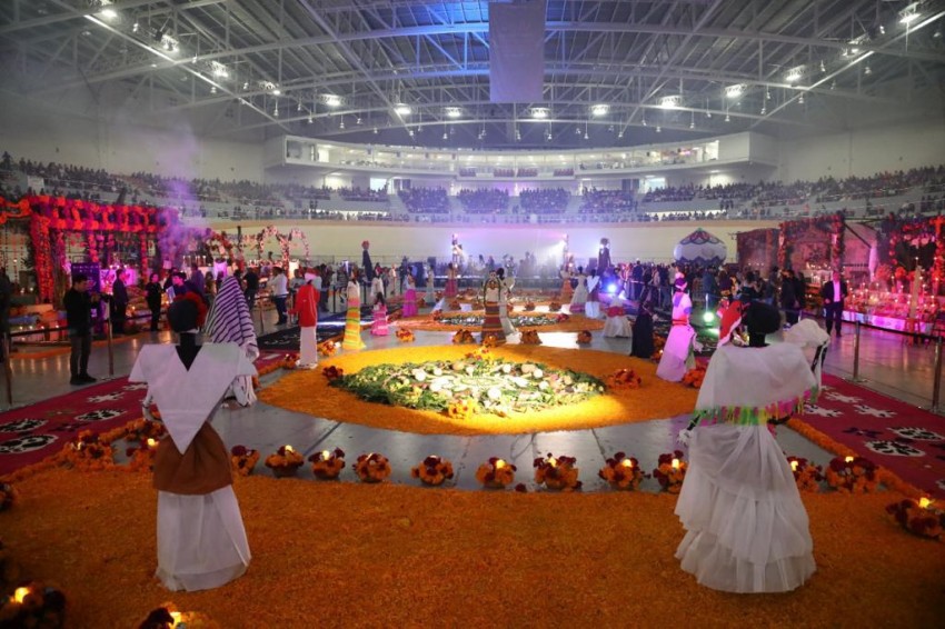 Momentos antes de la inauguración, catrinas y personajes alusivos a la festividad protagonizaron el paseo denominado Ollin (palabra nawatl que significa movimiento), desde el centro de la ciudad y hasta la sede de la exhibición monumental, integrada también por los kallis (casa en nawatl) de enseñanza de lenguas, artesanías, danzas, sabores, talleres, juegos y deportes.