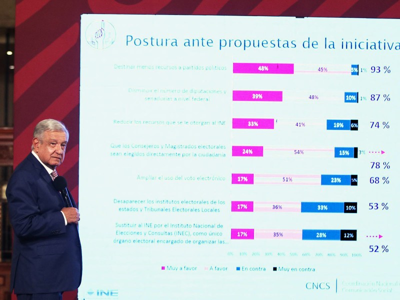 Con base en los resultados de una encuesta que ocultó el mismo INE, el presidente Andrés Manuel López Obrador destacó que la ciudadanía está a favor de la reforma electoral.