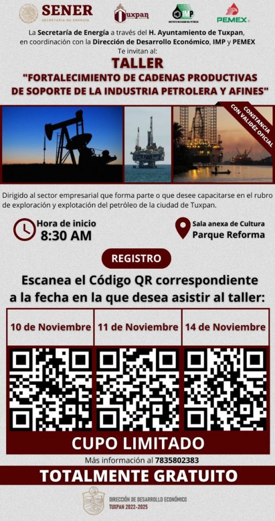 El Gobierno de Tuxpan, a través de la Dirección de Desarrollo Económico, invita al sector empresarial a participar en el Taller de “Fortalecimiento de Cadenas Productivas de Soporte de la Industria Petrolera y Afines”.