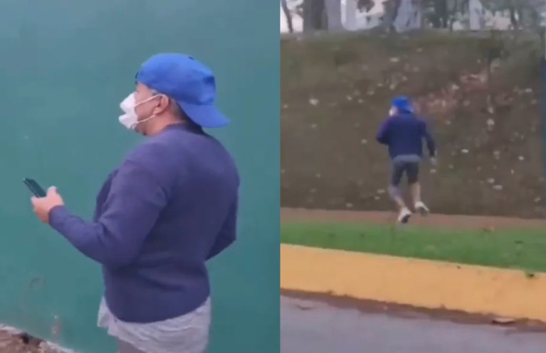 El acosador, quien se muestra sorprendido por la actitud de su víctima, decide huir corriendo del lugar.