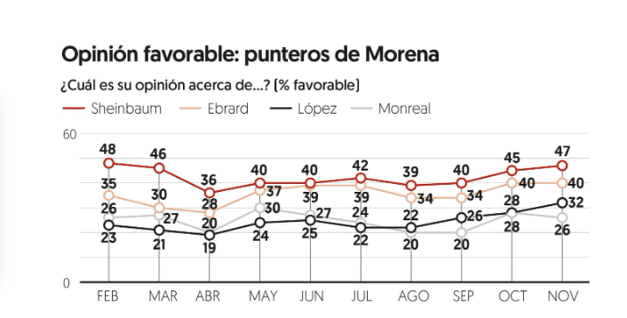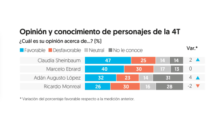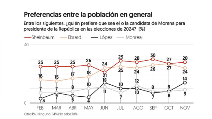 Al preguntar a quie?n de los cuatro prefieren como abanderado de Morena en 2024, Sheinbaum capta 28 por ciento de las preferencias, cuatro puntos adelante de Ebrard, quien tiene 24 por ciento. En esta misma pregunta, Ada?n Augusto Lo?pez avanzo? de 8 a 14 por ciento en un mes, cinco puntos adelante de Monreal, que suma 9 por ciento.