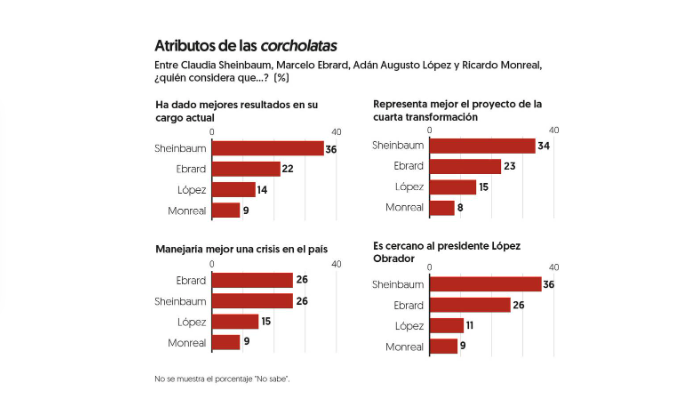 Entre los atributos que se le ven a Sheinbaum esta?n los resultados de su gobierno (36 por ciento de menciones), y que ella representa mejor el proyecto de la 4T. En manejo de crisis empata con Ebrard (26 por ciento cada uno).
