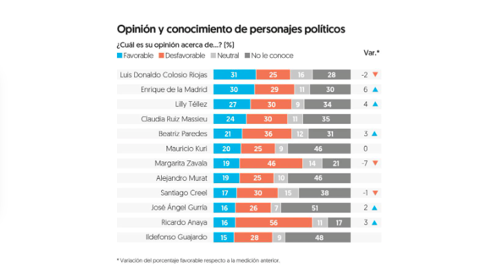 Del lado de la oposicio?n, el emecista Luis Donaldo Colosio cuenta con 31 por ciento de opinio?n favorable, un punto arriba de Enrique de la Madrid, que obtiene 30 por ciento. Le sigue Lilly Te?llez, con 27 por ciento.