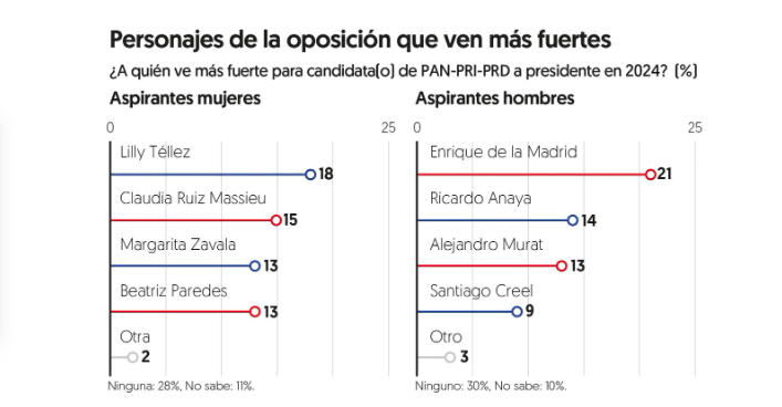 Al preguntar a cua?l de las aspirantes mujeres a la Presidencia ven ma?s fuerte, Lilly Te?llez obtuvo 18 por ciento de las menciones; Ruiz Massieu, 15 por ciento, y Margarita Zavala y Beatriz Paredes, con 13 por ciento cada una.