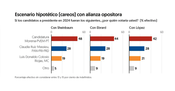 En escenarios hipote?ticos, Morena aventaja las preferencias con cualquiera de sus tres principales corcholatas, aunque con diferente puntuacio?n: enfrentado a Ruiz Massieu como abanderada de una alianza PAN-PRI-PRD y a Colosio de MC, Sheinbaum obtiene 48 por ciento de las preferencias; Ebrard, 44 por ciento, y Ada?n Lo?pez 42 por ciento; mientras que Ruiz Massieu capta 28 por ciento en cualquiera de estos escenarios, y Colosio, entre 19 y 21 por ciento.