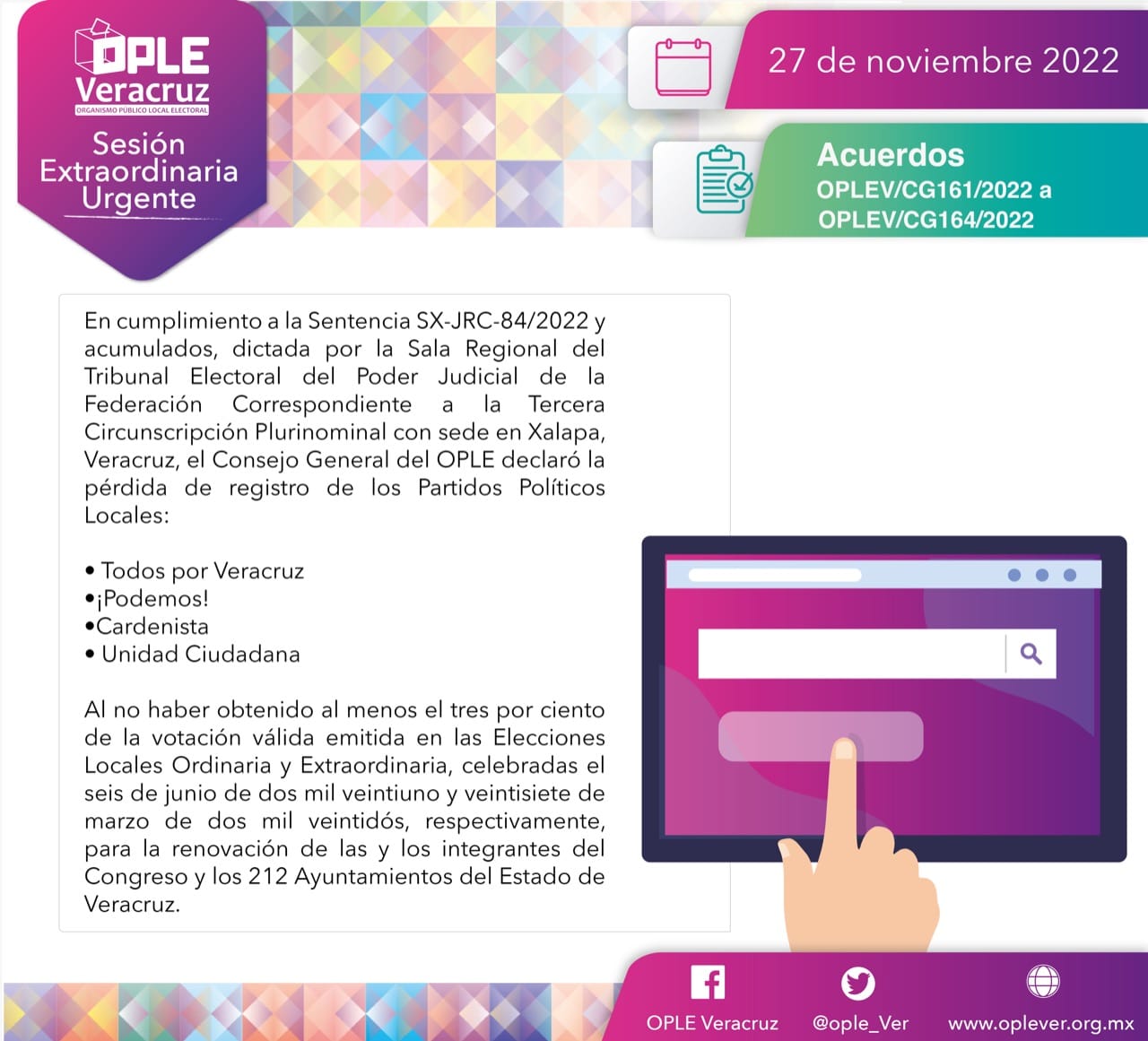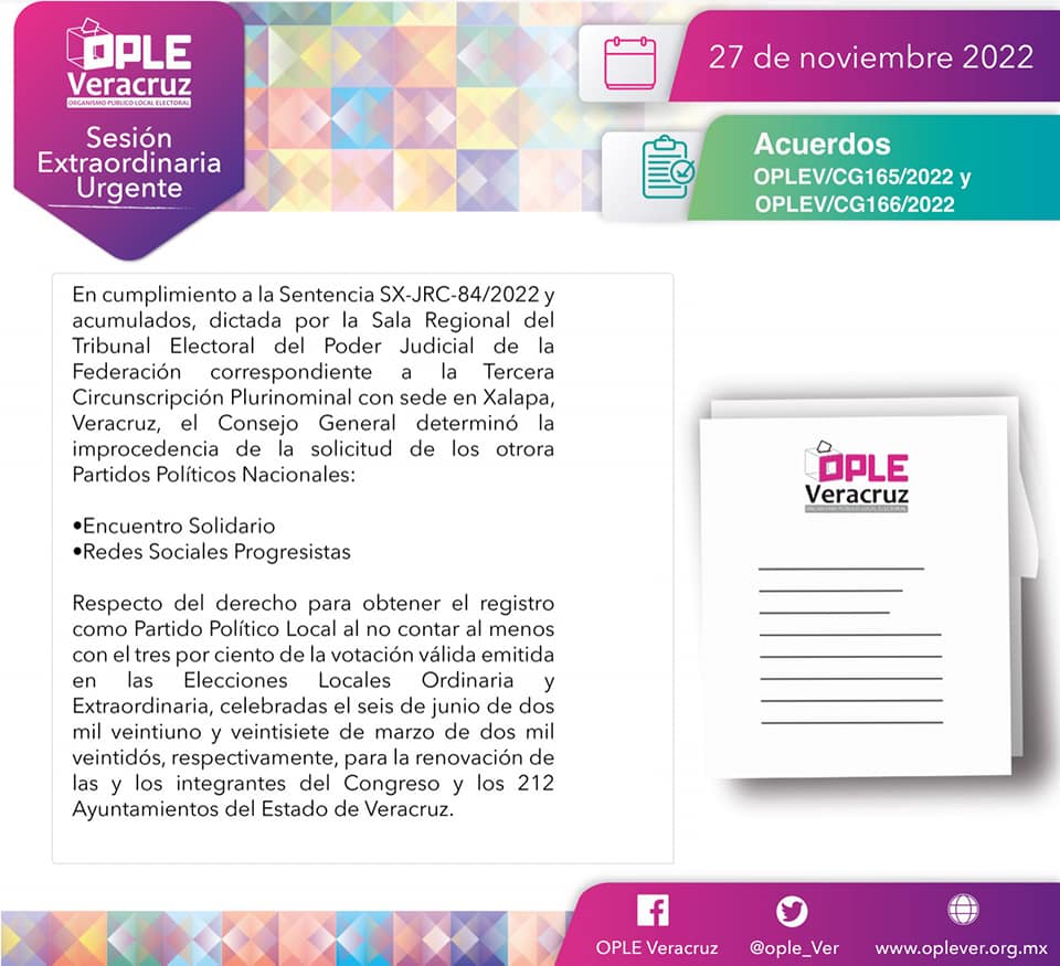 En Sesión Extraordinaria Urgente del Consejo General del OPLE Veracruz, se dio cumplimiento a la sentencia, ya que ninguno de los partidos políticos mencionados cumple al menos, con el tres por ciento de la votación válida emitida en las elecciones locales Ordinaria y Extraordinaria celebradas en junio de 2021 y en marzo de 2022, respectivamente, para la renovación de las y los integrantes del Congreso Local y los 212 Ayuntamientos del Estado.