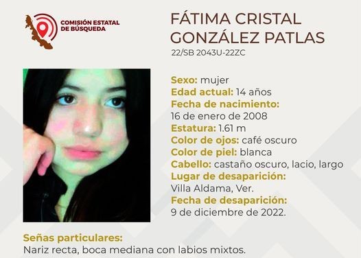 La menor de 14 años Fátima Cristal González, desapareció el 9 de diciembre del 2022 en el municipio de Villa Aldama, y aunque su familia interpuso denuncia ante la Fiscalía General del Estado (FGE) y hay una ficha emitida por la Comisión Estatal de Búsqueda, la autoridad en nada ha mostrado resultados de las investigaciones.