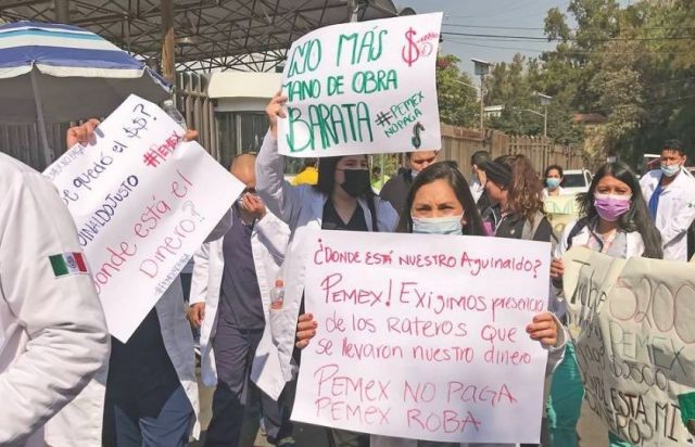 Ante la falta de pago del monto correspondiente de su aguinaldo, médicos residentes de hospitales de Petróleos Mexicanos (Pemex), marcharon y bloquearon avenidas principales en Ciudad de México, Veracruz, Guanajuato y Tabasco para exigir el cumplimiento de sus derechos laborales.