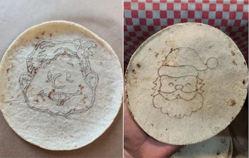 Pinos de Navidad, Santa Claus, muñecos de nieve, nacimientos, Superman, caricatura del presidente Andrés Manuel López Obrador y la influencer Karely Ruiz, son algunas de las imágenes grabadas en tortillas que oferta la tortillería Ruby, de San Andrés Tuxtla, en Veracruz.