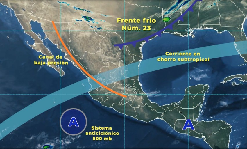 Las condiciones meteorolo?gicas antes descritas sera?n originadas por el Frente Fri?o Nu?mero 23, que recorrera? el noreste y oriente del pai?s, asi? como por el litoral del Golfo de Me?xico, e interaccionara? con la corriente en chorro subtropical, la masa de aire fri?o que lo impulsa, el ingreso de humedad del Mar Caribe y un canal de baja presio?n que se ubicara? sobre la Peni?nsula de Yucata?n.