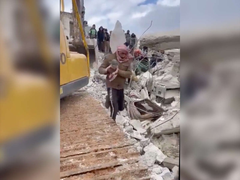 Entre fierros retorcidos y pesadas lozas de concreto, la recién nacida, que aún estaba unida a su madre por el cordón umbilical, fue rescatada con vida después de pasar varias horas tras los escombros en la ciudad de Jindiries, Siria. Con polvo en todo su cuerpo, un hombre logró sacarla del edificio colapsado y corrió con ella para que se le brindara atención médica por la situación por la que pasó.