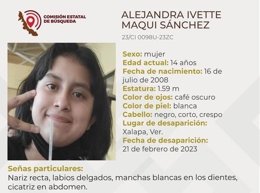 La Comisión Estatal de Búsqueda, reportó la desaparición de una menor de 14 años de edad en Xalapa, capital de Veracruz.