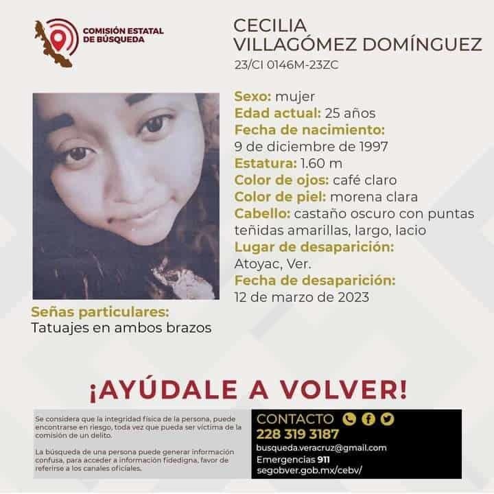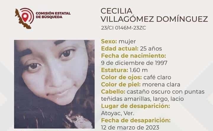 La joven Cecilia Villagómez Domínguez de 25 años, tiene una estatura de 1.60 metros, ojos café claros, de tez morena clara y con cabello castaño oscuro con puntas teñidas amarillas, largo y lacio, además de que cuenta con tatuajes en ambos brazos.