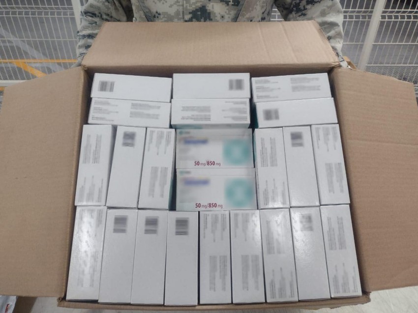 Medicamentos con la leyenda “Propiedad del sector Salud, prohibida su venta”, fueron interceptados por elementos de la Guardia Nacional en una paquetería del estado de Querétaro.