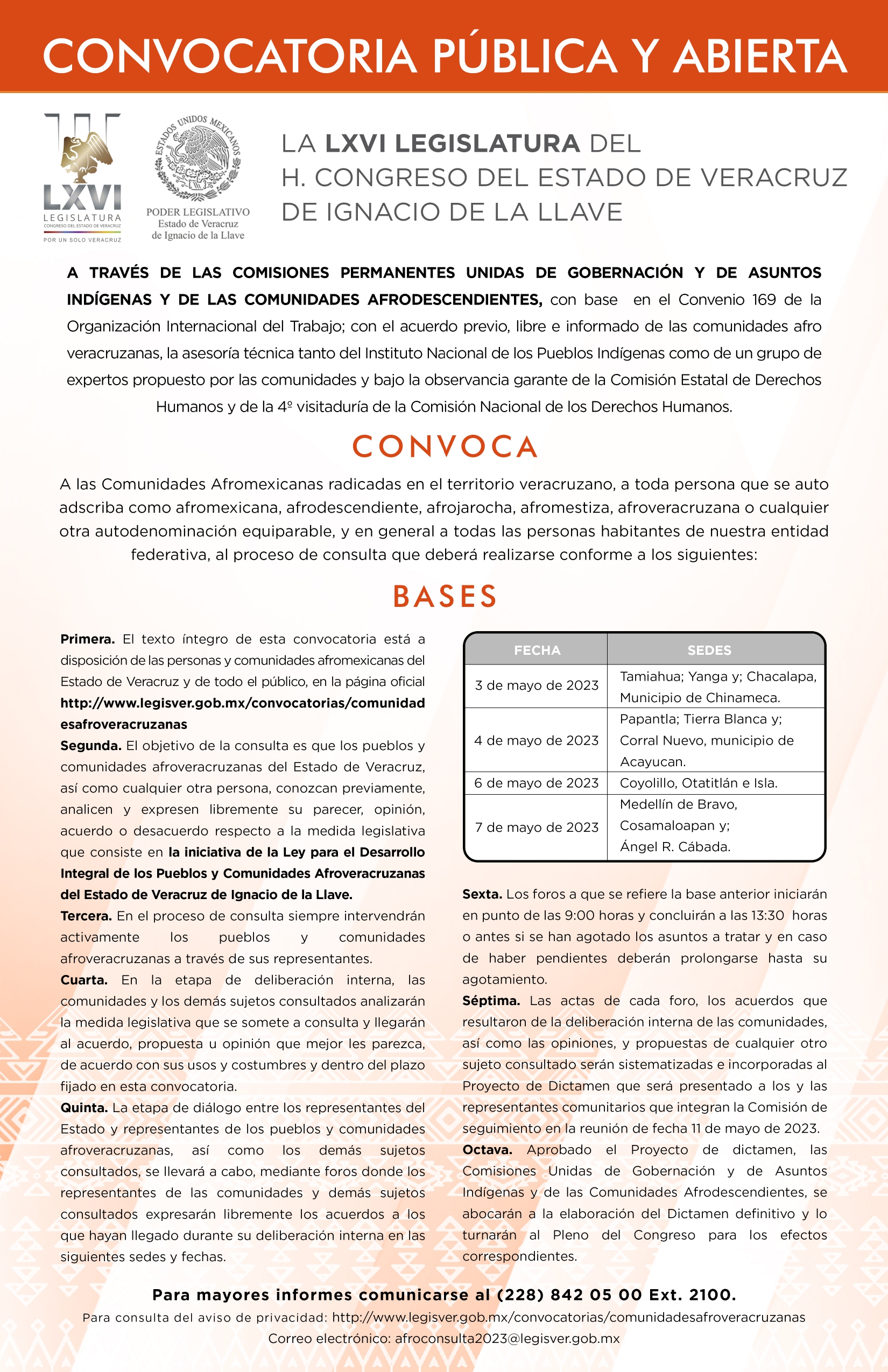 En el documento se convoca a las comunidades afromexicanas radicadas en territorio veracruzano, a toda persona que se auto adscriba como afromexicana, afrodescendiente, afrojarocha, afromestiza, afroveracruzana o cualquier otra autodenominación equiparable, y en general a todas las personas habitantes de la entidad federativa, al proceso de consulta conforme a las bases establecidas.