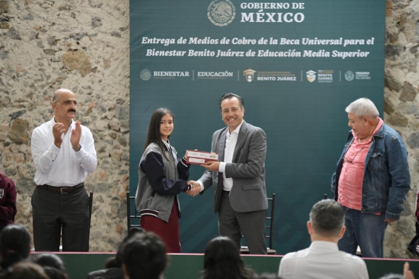 Al presidir la entrega de tarjetas de la Beca Universal para el Bienestar Benito Juárez de Educación Media Superior a 200 jóvenes, el gobernador Cuitláhuac García Jiménez les pidió aprovechar este impulso y seguir preparándose, así como evitar y alejarse del consumo de drogas.