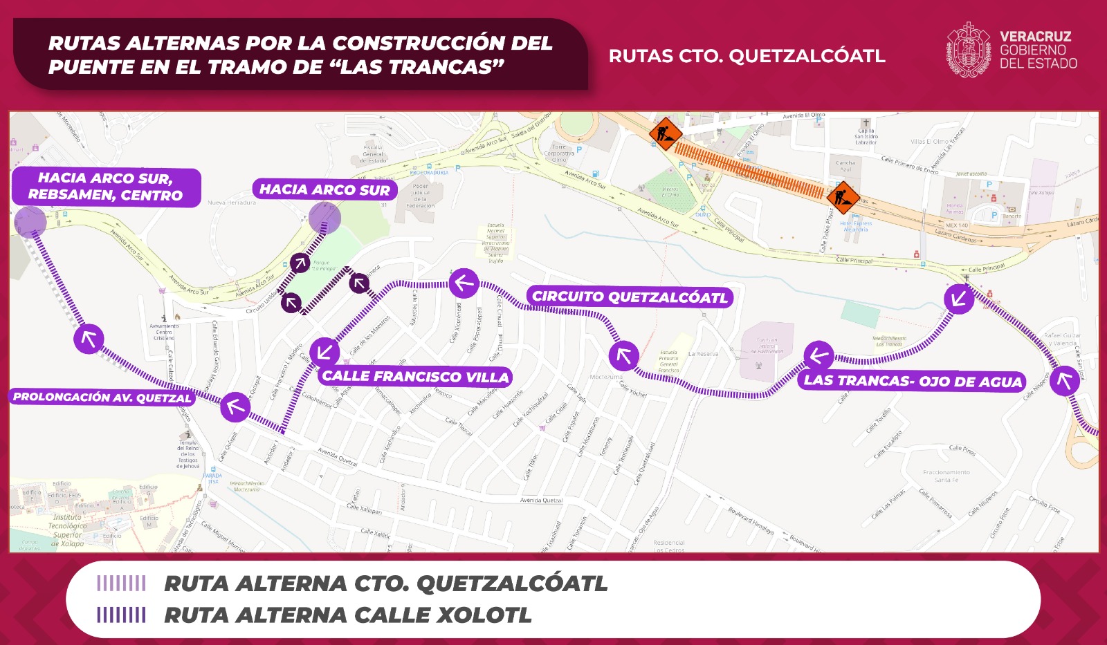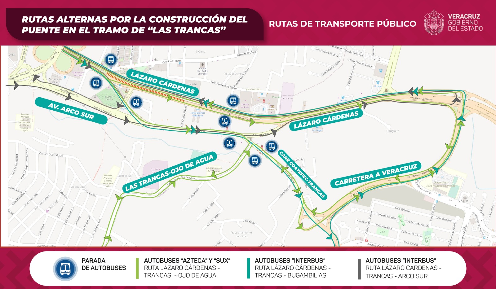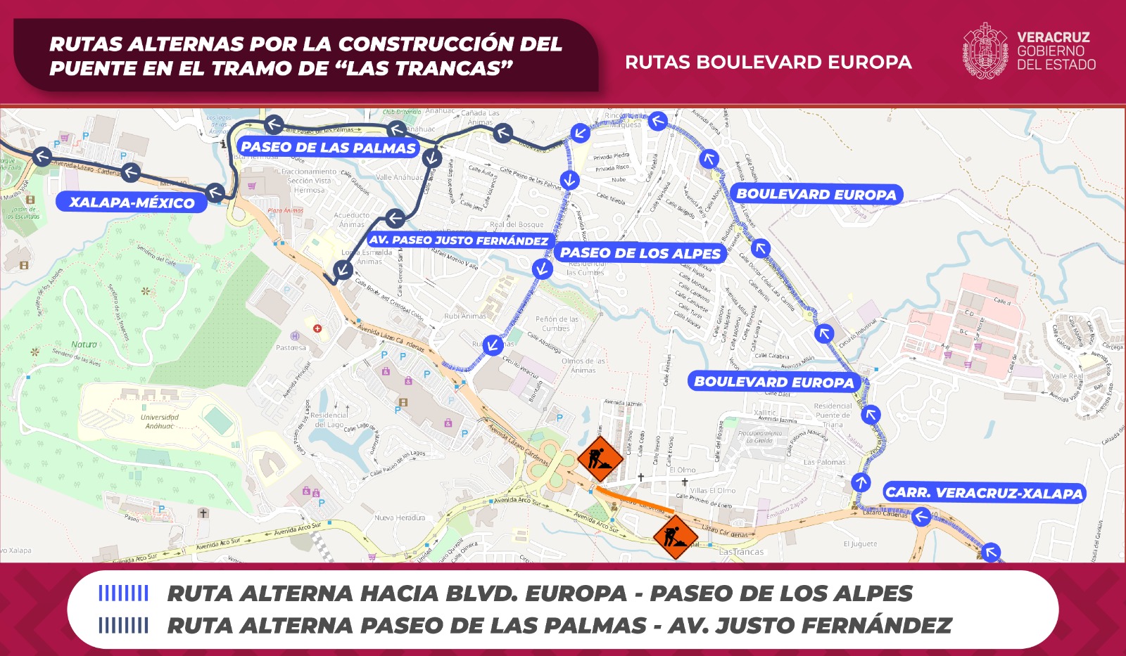 Para los automovilistas que lleguen de Veracruz y Emiliano Zapata está disponible el bulevar Porfirio Díaz hacia Europa y Paseo de las Palmas; o calle Fresno y avenida Del Olmo más adelante; los que salgan de La Pradera y Bugambilias tienen como opción Francisco Villa (a Ojo de Agua) y avenida Quetzal hasta Arco Sur. La salida de Xalapa a Veracruz será por la calle principal de Las Trancas.