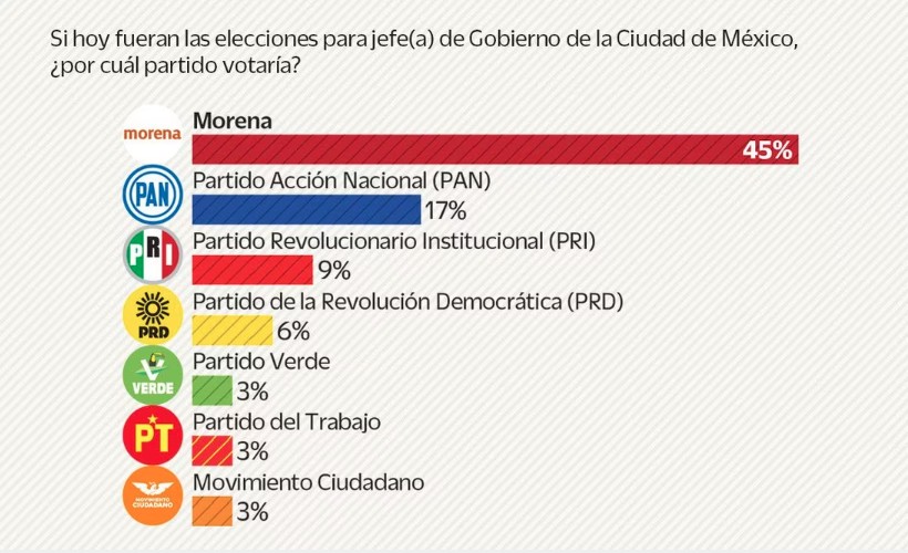 La intención de voto con boleta genérica (voto por partido) para la Jefatura de Gobierno muestra una clara ventaja de Morena (45%) sobre el PAN (17%) y el PRI (9%). Incluso sumando las cifras de los partidos que probablemente conformarán una alianza opositora (PAN, PRI y PRD), Morena se coloca a una distancia de 13 puntos (esto sin contar los 6 puntos de sus potenciales socios de coalición, el PVEM y PT). Mientras que 14% de los encuestados no manifestaron intención de voto (no respuesta).