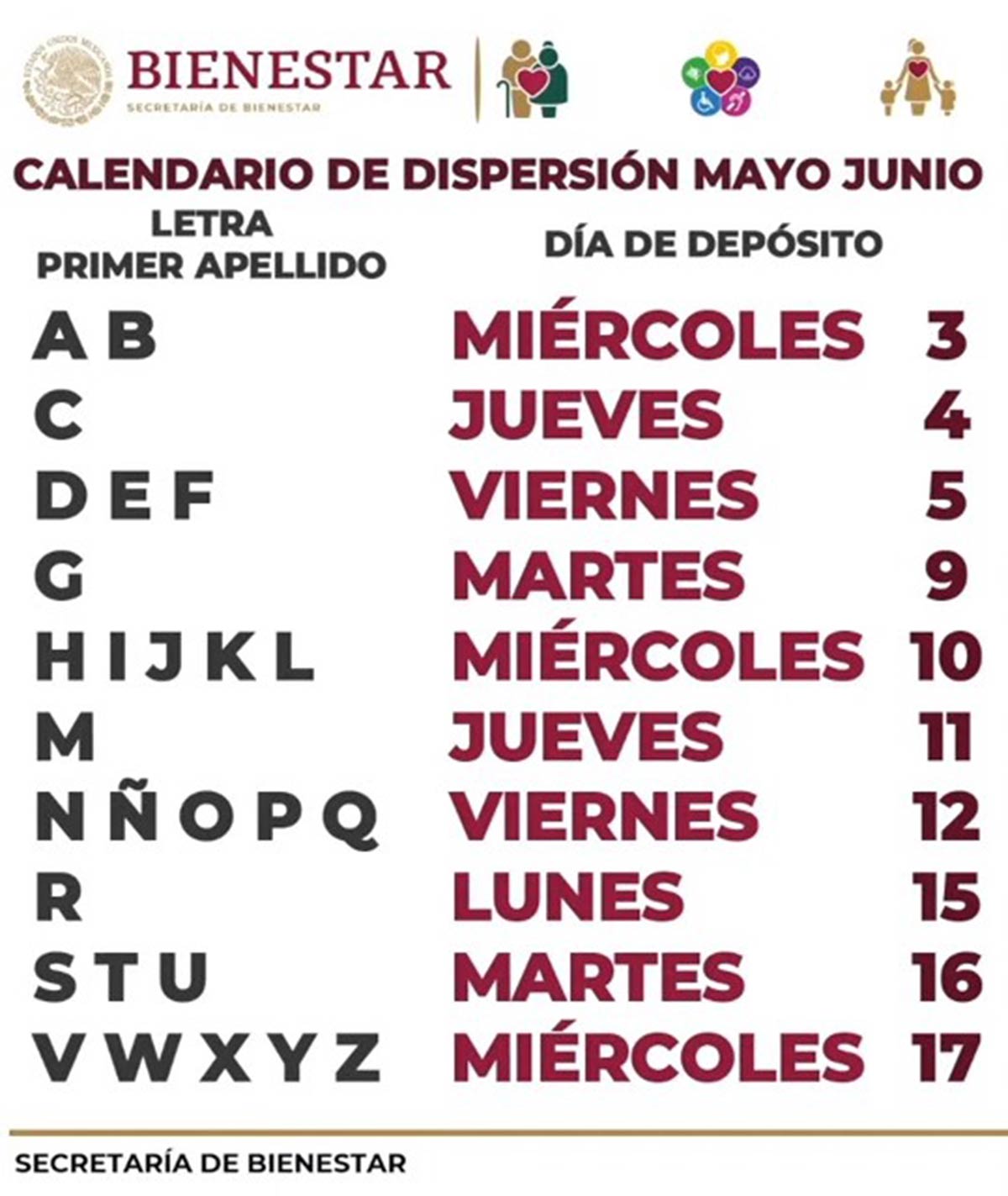 La secretaria del Bienestar, Ariadna Montiel, presentó el calendario de pagos de los programas del Bienestar, los cuales se depositarán del 3 al 17 de mayo del año en curso.