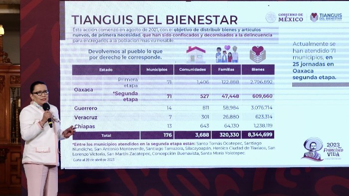 El Tianguis del Bienestar ha beneficiado a la poblacio?n ma?s necesitada de la Mixteca oaxaquen?a con la entrega, hasta hoy, de 609 mil 660 bienes nuevos a 47 mil 448 familias, reporto? la secretaria de Seguridad y Proteccio?n Ciudadana, Rosa Icela Rodri?guez.