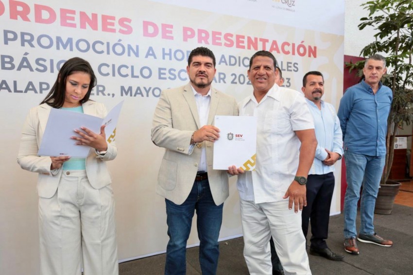 En un acto de justicia social y como parte del orden administrativo que hace la Secretaría de Educación de Veracruz (SEV), su titular, Zenyazen Escobar García, entregó órdenes de presentación del proceso de promoción de alrededor de tres mil horas adicionales en Educación Básica, del ciclo escolar 2022-2023, de los niveles educativos de Secundarias Técnicas, Generales, y Educación Física.