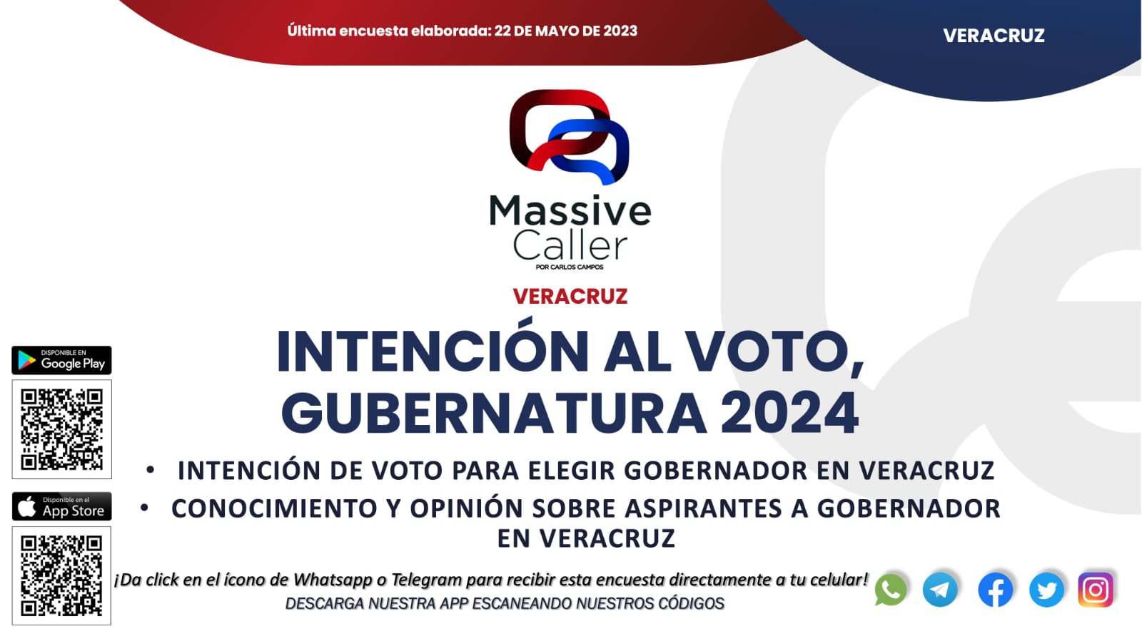 La secretaria de Energía, Rocío Nahle, y Morena encabezan las preferencias entre el electorado veracruzano para la próxima elección de 2024. Así lo muestra una encuesta realizada por la firma Massive Caller el 22 de mayo de 2023 sobre la intención del voto para la gubernatura.