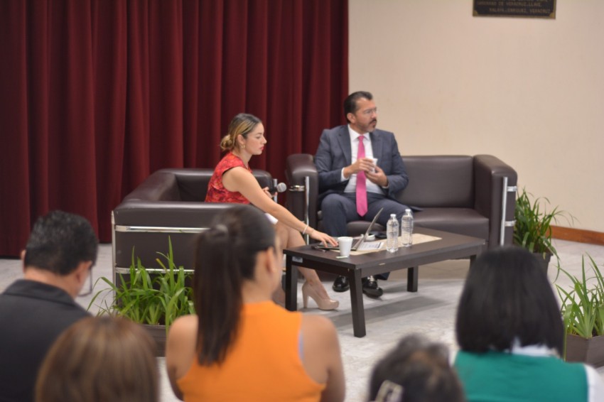 Asistieron al conversatorio la encargada del Instituto Veracruzano de las Mujeres (IVM), Rocío Villafuerte Martínez, y la encargada del Centro de Estudios para la Igualdad de Género y Derechos Humanos del Congreso del Estado (CEIGDH), Arhely Cuesta Briones.
