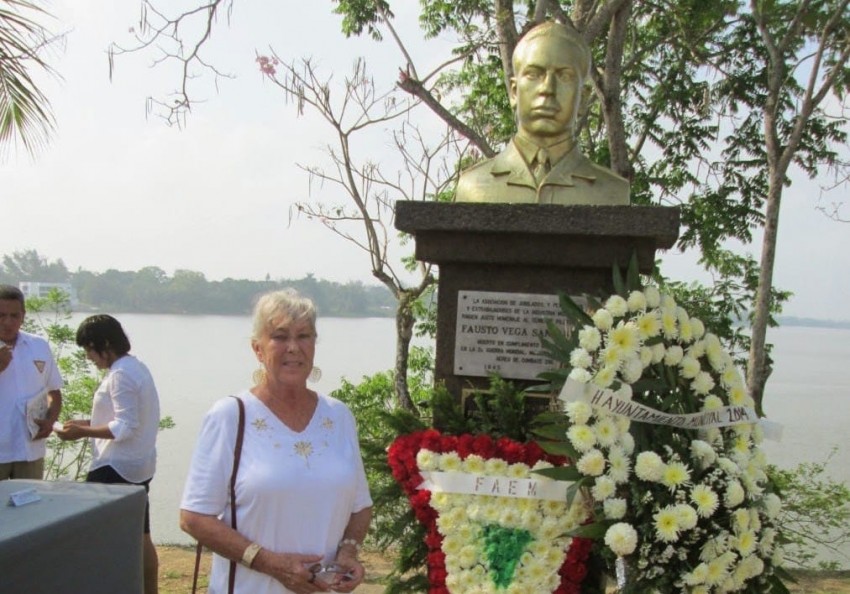 - Me llamo Nina Eibor Margareta Altrichter, soy de origen sueco, viuda de Esteban Carballo Reyes, lo recuerdo mucho cada vez que vengo al homenaje del fallecimiento de Fausto Vega Santander, mi esposo también fue integrante del Escuadrón 201, no fue piloto, fue de intendencia, no murió en combate, Esteban regresó con vida a México, aquí en Santiago de la Peña murió el 20 de marzo del 2002, hace ya 12 años.