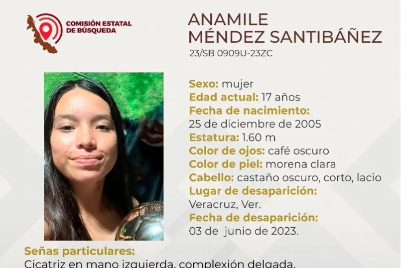 Anamile Méndez Santibáñez, tiene 17 años de edad, mide 1.60 metros de altura, ojos color café oscuro, color de piel morena clara, cabello castaño oscuro corto, desapareció el 3 de junio del presente año.