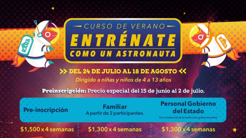 Del 24 de julio al 18 de agosto, en el Museo Kaná, se realizarán actividades físicas y mentales dirigidas a niñas y niños de 4 a 13 años de edad, tales como talleres, juegos, experimentos y actividades deportivas, de contacto con la naturaleza y de convivencia. Cada una de ellas, acompañadas de su explicación científica que permitirá que las y los participantes comprendan el entrenamiento de un astronauta.