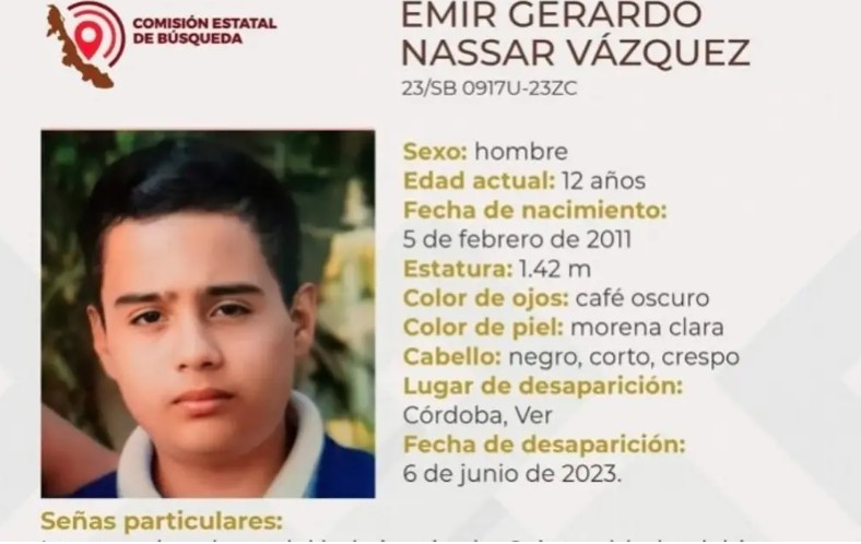 Por último, el adolescente Emir Gerardo Nassar Vázquez de 12 años y con domicilio en el municipio de Córdoba, desapareció el martes 6 de junio y tiene un lunar en la cabeza del lado izquierdo, cejas pobladas, labios gruesos, así como una estatura de 1.42 metros, ojos café oscuro, de tez morena clara y con cabello negro, corto y crespo.