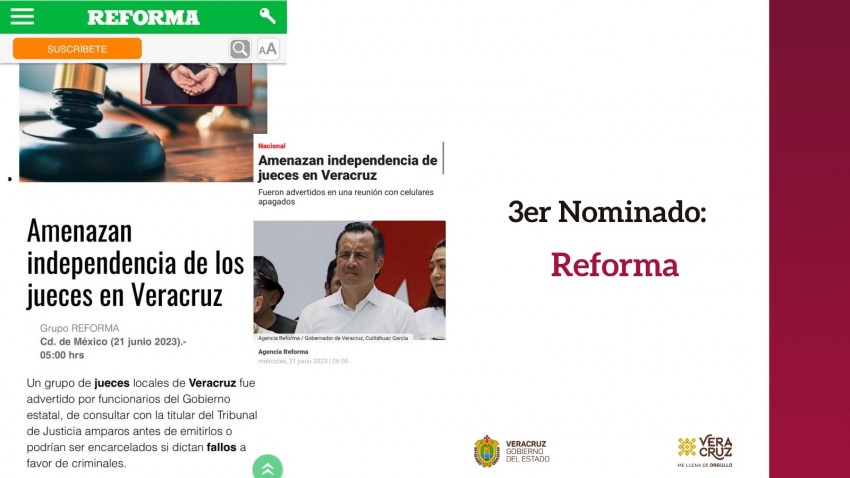 Continuó un video del programa Por la mañana de Radio Fórmula, en el que replican lo anterior en voz del periodista Ciro Gómez Leyva, para terminar con el Reforma y su encabezado Amenazan independencia de los jueces de Veracruz; notas que reportaron un fuerte dispositivo de seguridad y retención de teléfonos celulares que algunos presentes decidieron hacerlo público “bajo anonimato”.